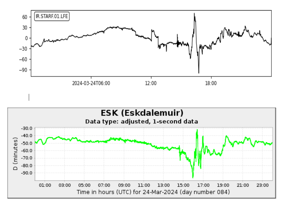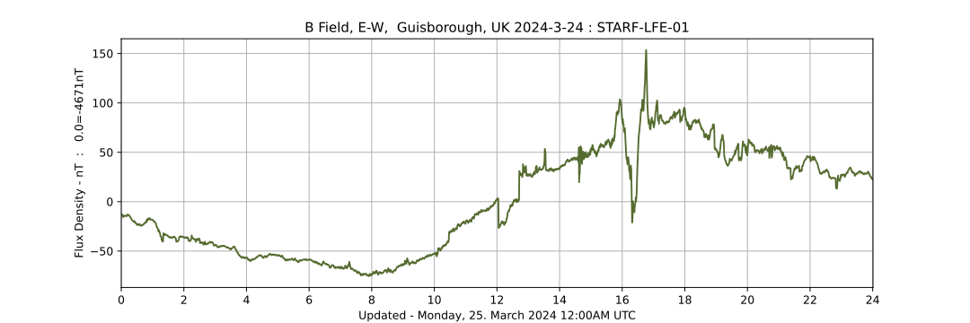 Early on Saturday 23 March 2024, the Sun released a strong X1.1 solar flare, the most powerful possible type, from a particularly active region pointing directly towards Earth. The earth field magnetometer detected a sharp variation in the earths magnetic field corresponding to the arrival of a bubble of solar material ejected by this C.M.E. 40 hours later. A similar signal was recorded by B.G.S. magnetometers in Scotland. Comparison of this system’s plots with those from professional geophysics magnetometry stations help validate this system as capable of generating research grade data at low cost