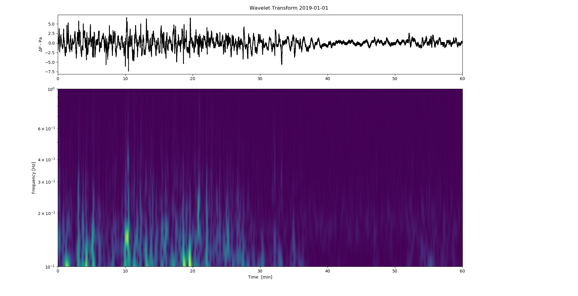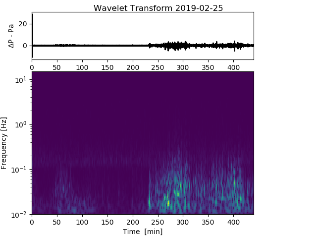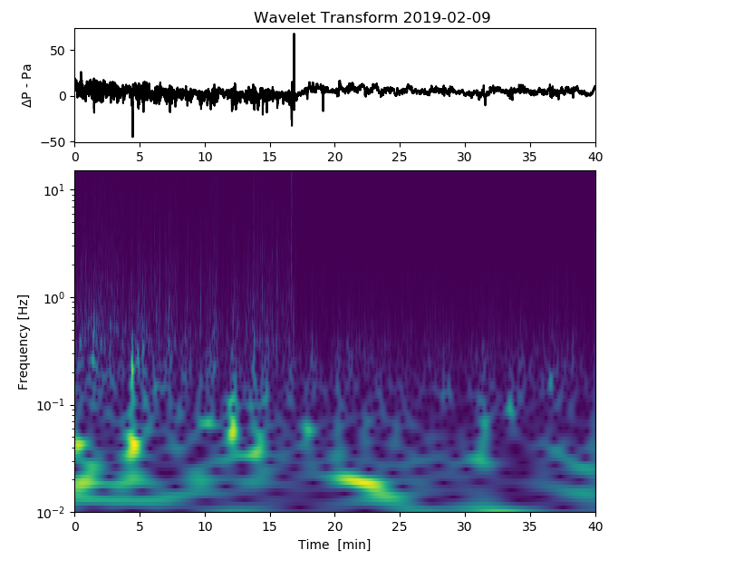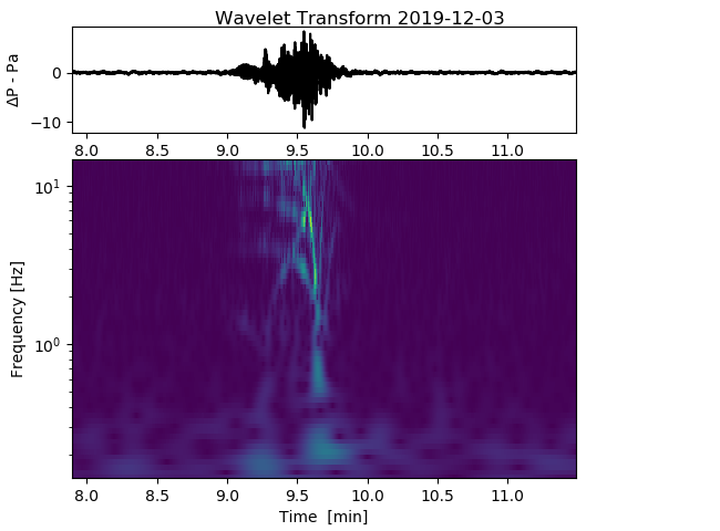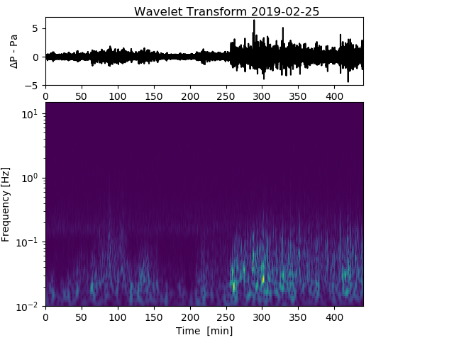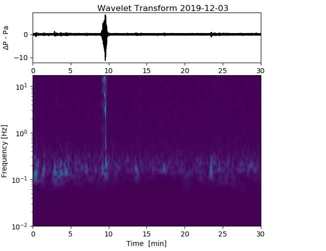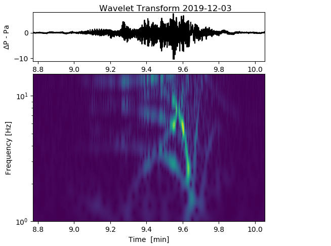 On 3 rd December I heard a helicopter passing - probably a Chinook. Clearly picked up by both my infrasound monitors a simple wavelet analysis shows a clear signal in the 5-12Hz range, with clean sin components at 2-3Hz - (image bottom right). I am planning on building a 3 rd portable device with a somewhat more sensitive mems sensor over Christmas. It may be worth extending the sampling rate to ~100Hz permitting signals up to 50Hz to be captured. A day hanging around the local airfield may provide interesting data and a chance for my son to do some analysis on this.
